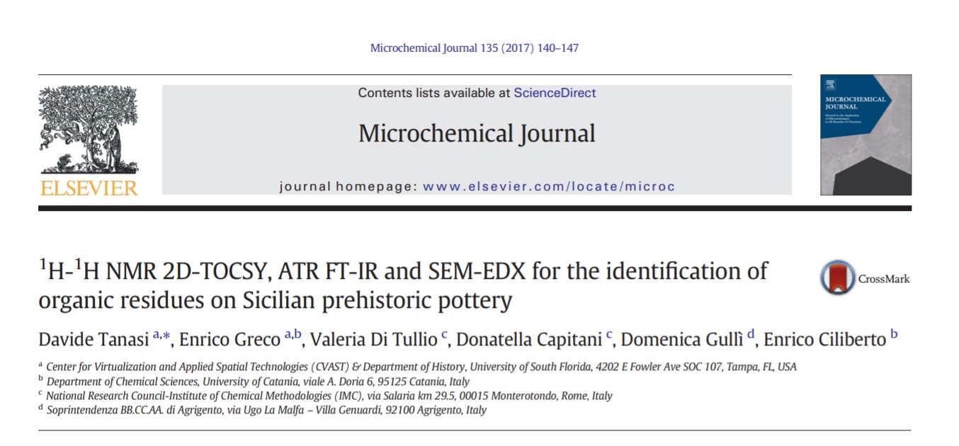 combined analytical research via 1H-1H NMR 2D-TOCSY, ATR FT-IR and SEM-EDX on organic residues on pottery from two Sicilian prehistoric sites of Monte Kronio and Sant’Ippolito. The goal was that to shed new light on the use of certain ceramic shapes and infer some hypothesis about ancient dietary habits.